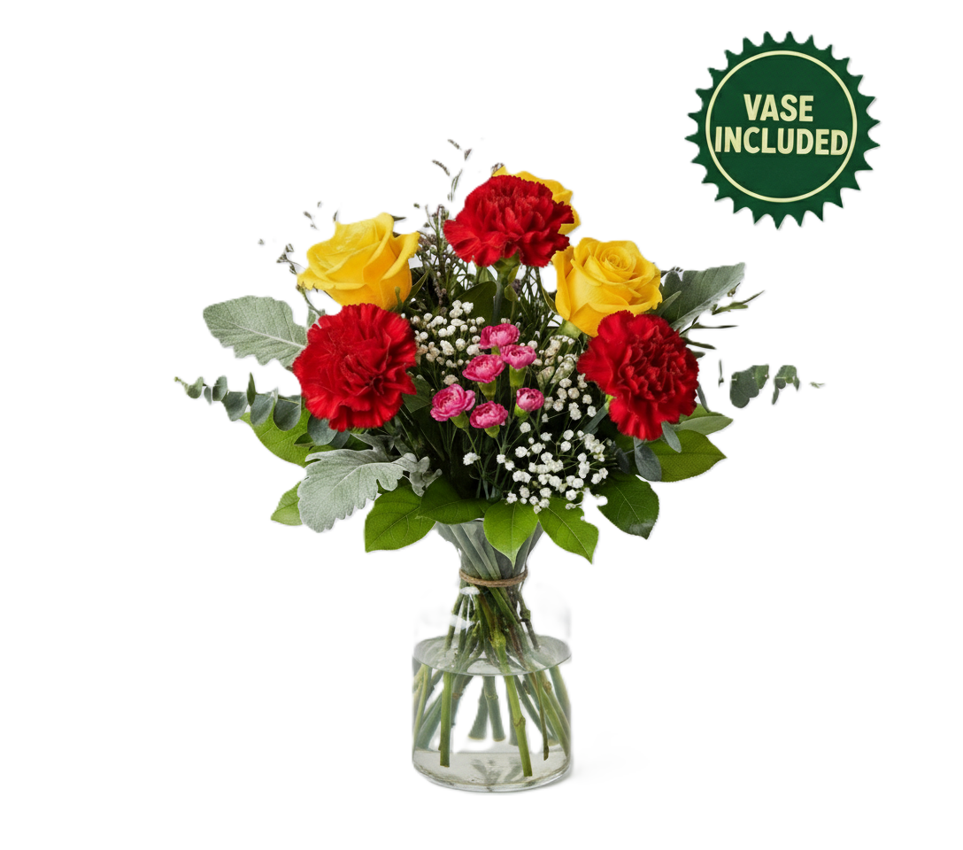 A vibrant mix of carnations, roses, and delicate filler flowers with varied greenery in a clear vase. Perfect for any occasion.