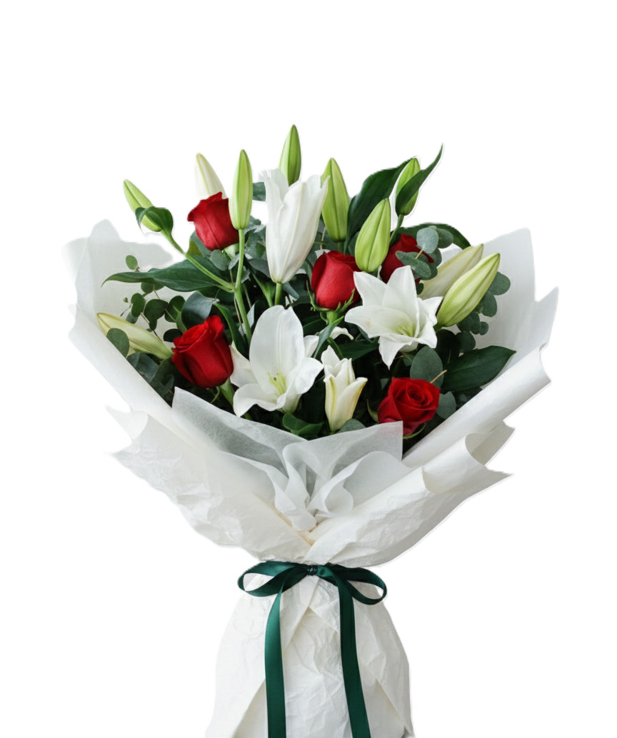 Red roses and white lilies form a striking bouquet, wrapped in crisp white paper, offering a classic romantic gesture.